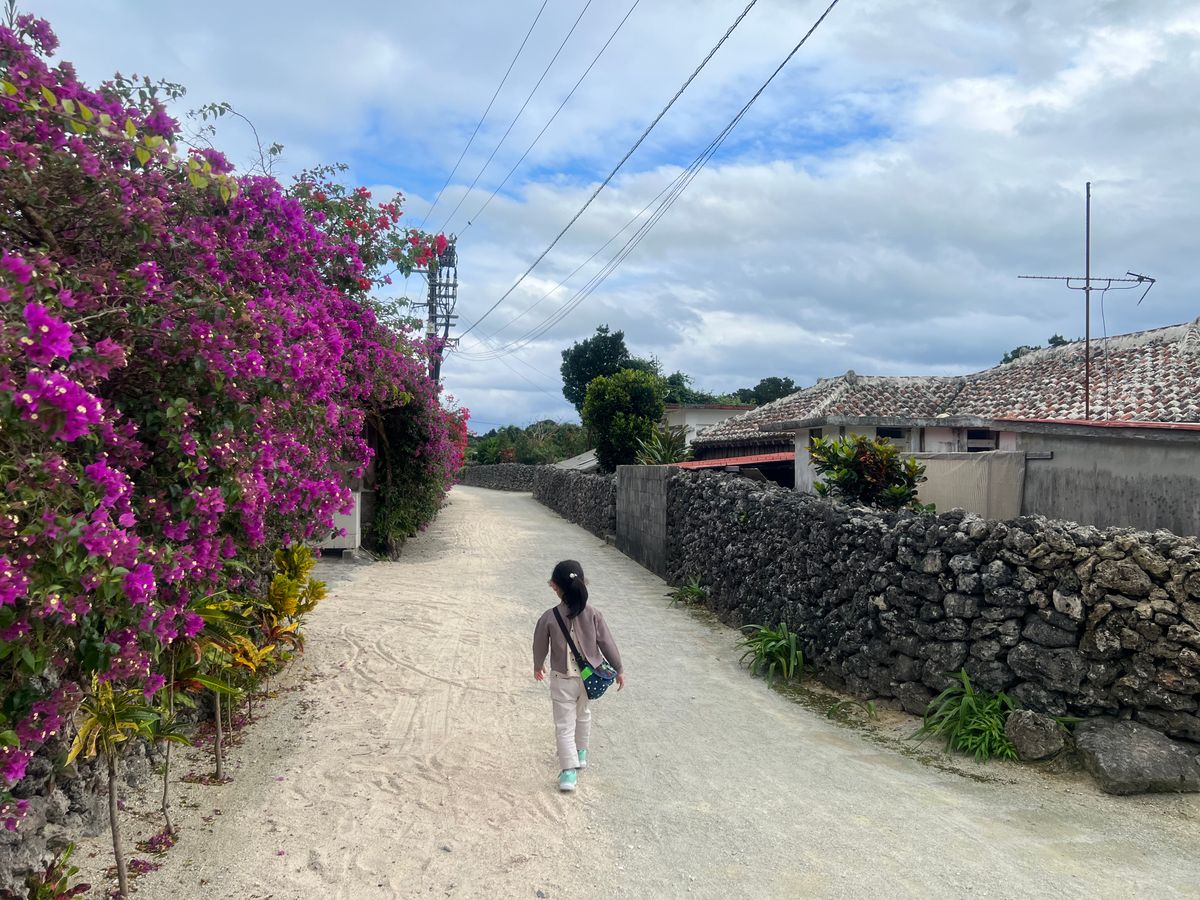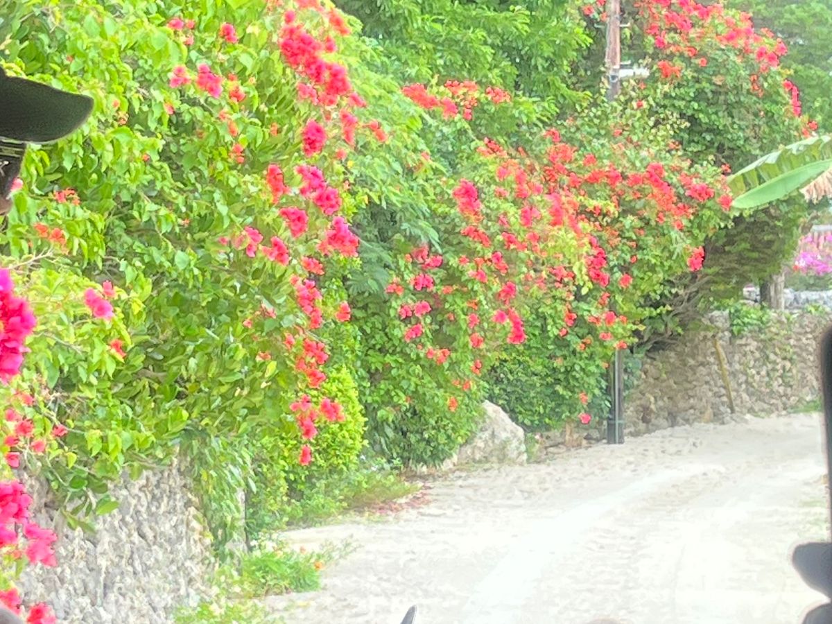 竹富島のお話を聞きながら、水牛車に揺られてゆっくり前に進んでいき、街並みの写真を撮ったり、沖縄の花や植物の写真を撮ったりしながら、のんびりとした時間を過ごしました。