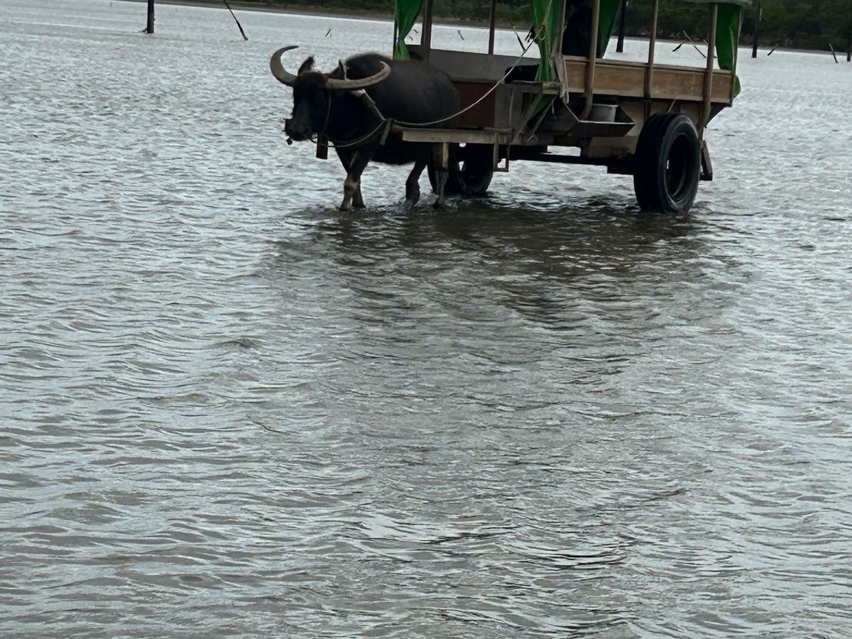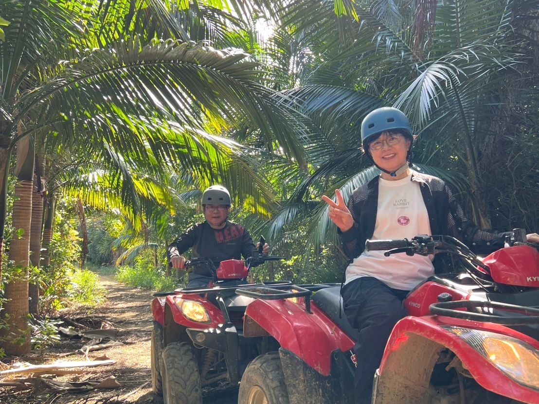 前日は激しい風雨で心配していました。当日は曇り時々小雨。バギーは長靴と合羽を貸してもらい体験できましたが、まあまあ大きな水溜まりを進んだり、カーブもぬかるんでいてスリル満点!何度もコースアウトしそうになりながら、密かにキャーキャー言って楽しみました。その後は水牛達の働きぶりに感心!水牛の男の子はとても頼もしかったです。