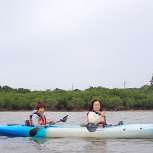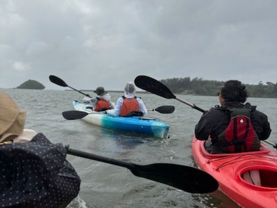 行ったのは仲間川のほぼ河口。しかも強風吹き荒び、時折り強い雨も打ち付ける、こんなんでカヌー大丈夫?と伺いましたら、ガイドさん軽やかに「カヌーは絶対大丈夫!今日は何もしなくても風が運んでくれる〜」って。その言葉を信じて、いざ出発。雨風に打たれながらも楽しい〜! しかし、だんだん風が強くなり、最終目的地まで行くのに、強い風に邪魔されどうなるの〜?と思ったら、ガイドさん、川の中に立ち、風上まで我々のカヌーを引っ張ってくださり、無事にカヌー体験を終えたのでした。