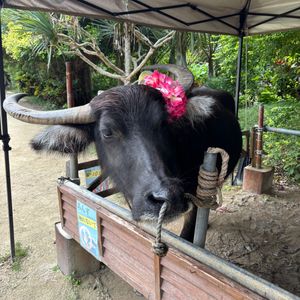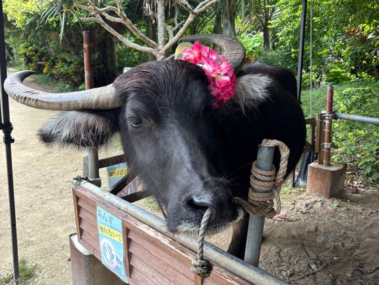 次に向かった由布島では、浅瀬の海を水牛車に揺られながらゆっくりと進む時間が本当に癒されました。水牛車のガイドさんが奏でる三線の音色が心地よく、島ならではの穏やかな時間が流れていました。由布島は滞在時間が短めではありますが、植物園の鮮やかな花々や南国らしい景色を楽しむことができ、とても充実した時間を過ごせました。