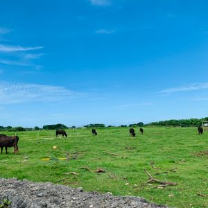 次にレンタサイクルを借りたものの、地面が砂利道でとても怖い。自転車を漕ぎながらマップを見る余裕もなく、一周はできなかった。特に良い場所は見つからず、楽しめなかった。また、少し細い道を通ると、水牛が道を塞ぐようにいた。特にロープで繋がれている感じもなく、伸び伸びしていて可愛らしいけど、大丈夫なのか心配になった。水牛は触られるのが苦手で、角でついて人に怪我をさせることがあると由布島で聞いていたため、観光客など、知らずに触ってしまうのではないかと。