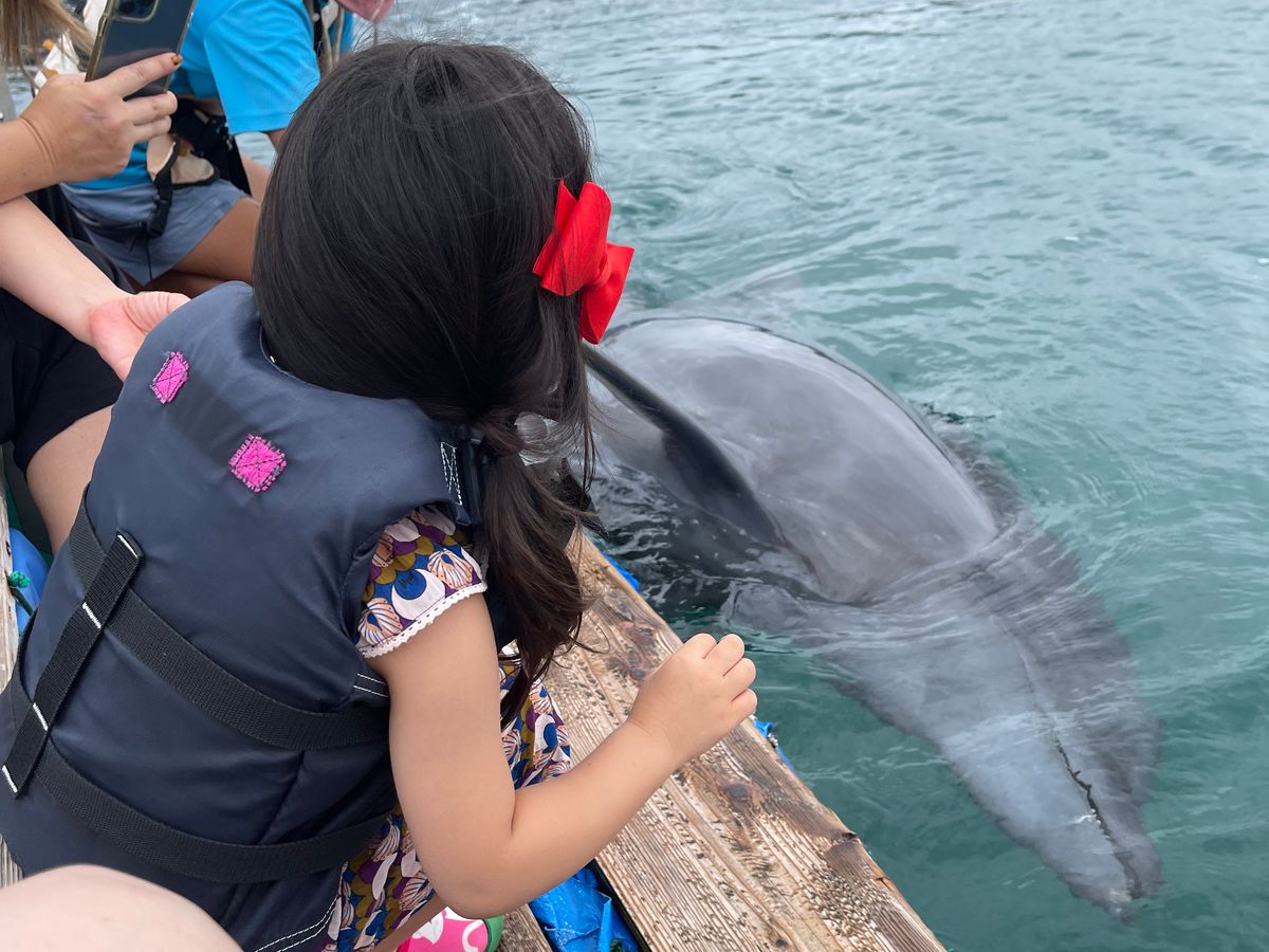 私の娘と夫はファミリーフレンドリーなイルカとのふれあい体験に参加しました。まず、イルカの紹介セッションがあり、その後、小グループ(5〜6人)に分かれて、近い距離でイルカに触れたり、交流したりしました。