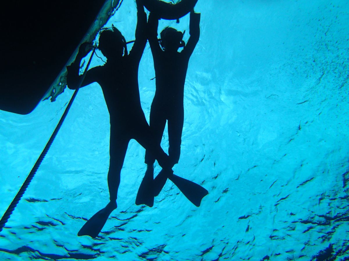 事前に呼吸の仕方や耳抜き、サインなど確認して船の階段を降りて海に入ります。