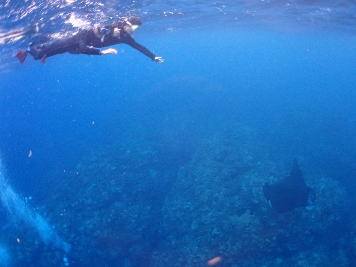 そして、なんといってもマンタです。2〜3メートル下方の仄暗い海中を滑るように現れ、悠然と私たちを追い越し、さらに戻って目の前を通り過ぎていく姿は圧巻でした。