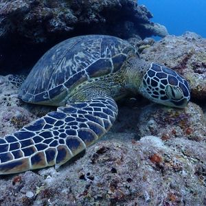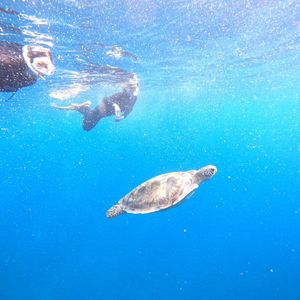 今回初めてのマンタツアー!本当は前日に別のツアーで予約していたのですが、天気が悪い事と口コミ評価が悪かった事から、キャンセル、口コミ評価が良かった今回のツアーに変更しました。それが大正解!口コミ評価で親切な元保育士の方とちょっと渋い船長に連れられ、いざ海に、船長も最近では一番海が穏やかで海の透明度も高いとの事で少し一安心。しかし、穏やかな波の揺れで、私たち夫婦は船酔い。後で出して下さった昼食の八重山そばも見事、海のお魚の餌になりました!ごめんなさい。船長からは、カメは100%見せてあげられるとの事で、海に入ると、それまでちょっと渋かった船長も、一生懸命私たちにカメを見せようと、海の底にいた海カメを起こし、海上へ誘い、すぐ目の前まで来る大迫力!妻も、もう手を伸ばせば触れるぐらいまで大接近し大満足!素潜りが少し出来る方ならきっと触れたと思います!次は、ポイントを変えて、マンタを探しに移動、船長からマンタが海上に上がって来ていると見せてくれ、再び海の中に!少し探すとマンタが正面からこちらにやって来るではないですか?!優雅に羽ばたくような雄大な姿は圧巻!お陰で元旦から良い一日がスタート出来ました!船酔いで食べても無駄になってしまった八重山そば以外は、大満足な一日でした!そして、とても印象的だったのが、船長が私たち夫婦の為に一生懸命、マンタを探してくれたのがとても印象的で、必ず見せてあげたいと思う気持ちに感動しました!今度行く時も、またお世話になりたいと思います!船長、元保育士の方、ありがとうございました!また会う日まで!