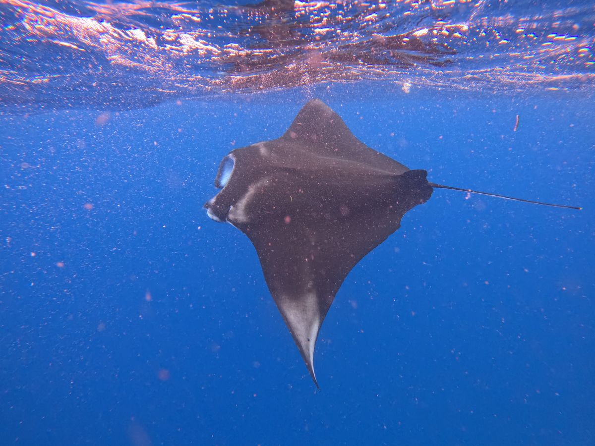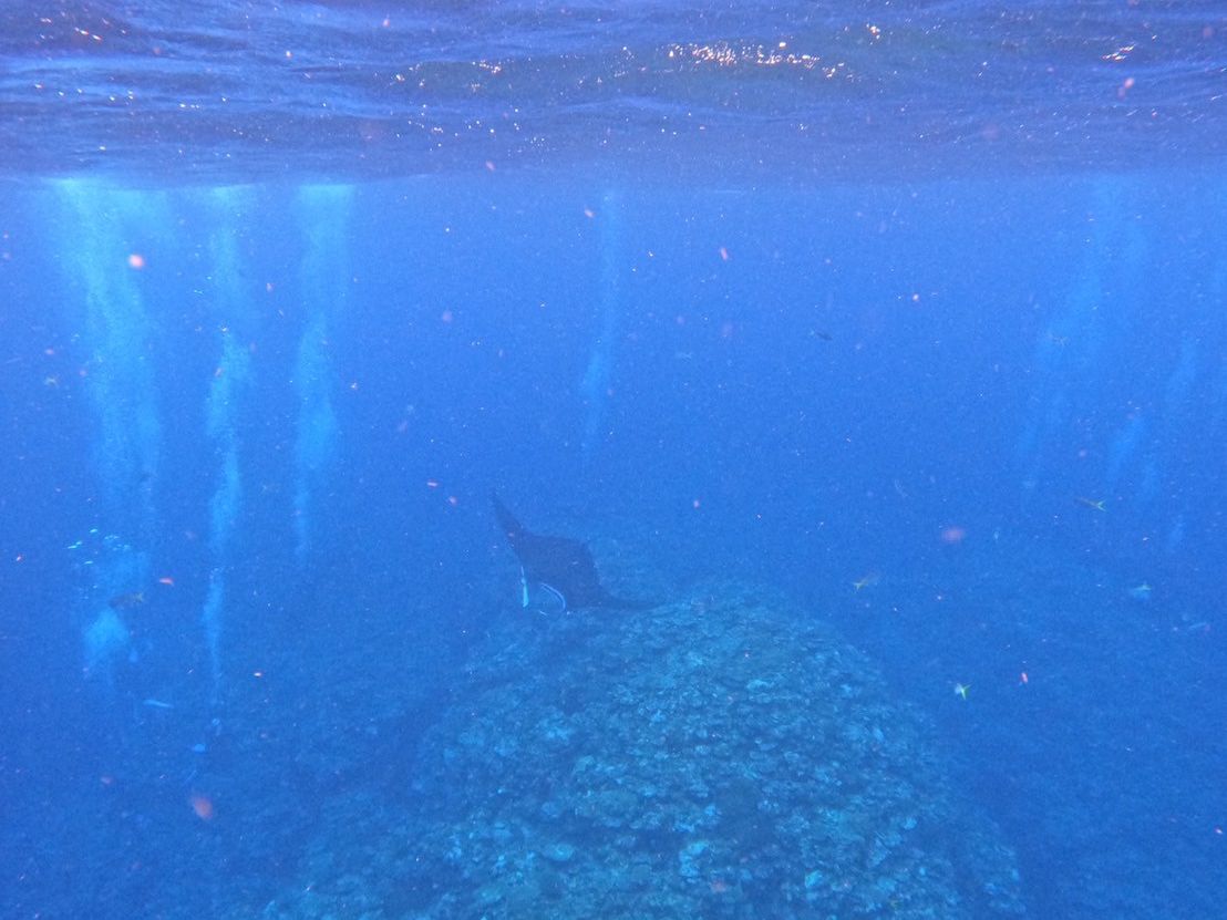 最初のマンタスポットで大本命・マンタに遭遇して感激!同じ日でもマンタが見られなかったツアーもあるそうなので、「マンタの女神」の異名を持つスタッフ・ゆりさんの引きの強さのお陰です。