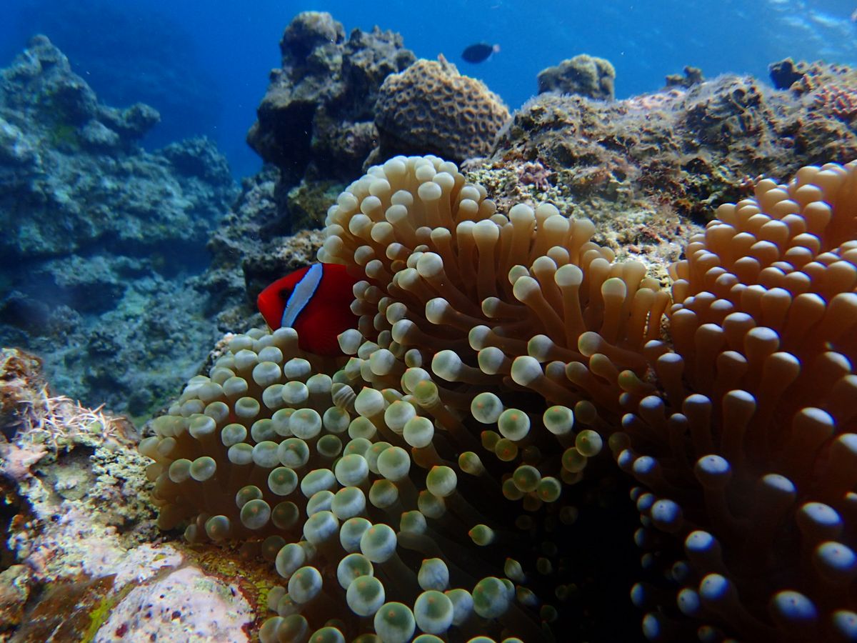 があるスポットでシュノーケリング。サンゴと小魚がとても綺麗。