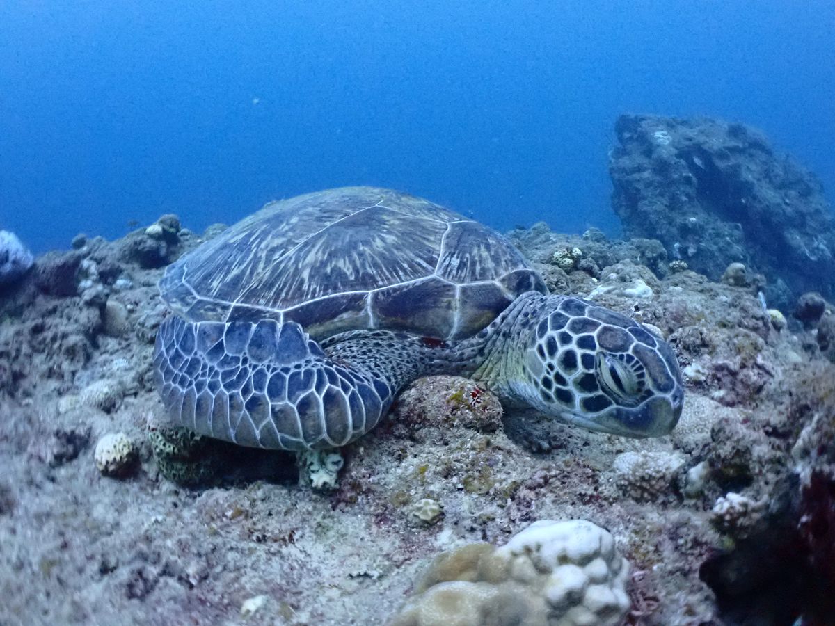 ウミガメは海底でおやすみ中でなかなか動いてくれなかったけれど、経験あるインストラクターさんのおかげで浮上してきたウミガメをバッチリみることができました。