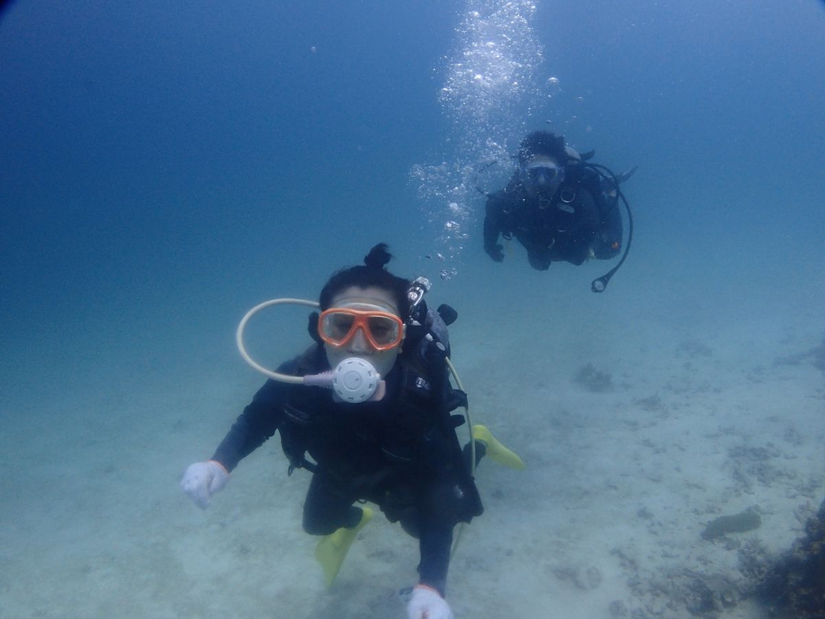 こちらのダイビングショップは、ご夫婦で経営なさっているこぢんまりとしたお店ですが、お二人ともとても人当たりのよく、私たち体験客との距離感も心地よい、素敵な方たちでした。私たちは、奥様の真紀先生がインストラクターについてくださったのですが、お会いしてから短時間のうちに、すぐに打ち解けることができ、信頼して安心して楽しめると、自ずと確信できるような方でした。