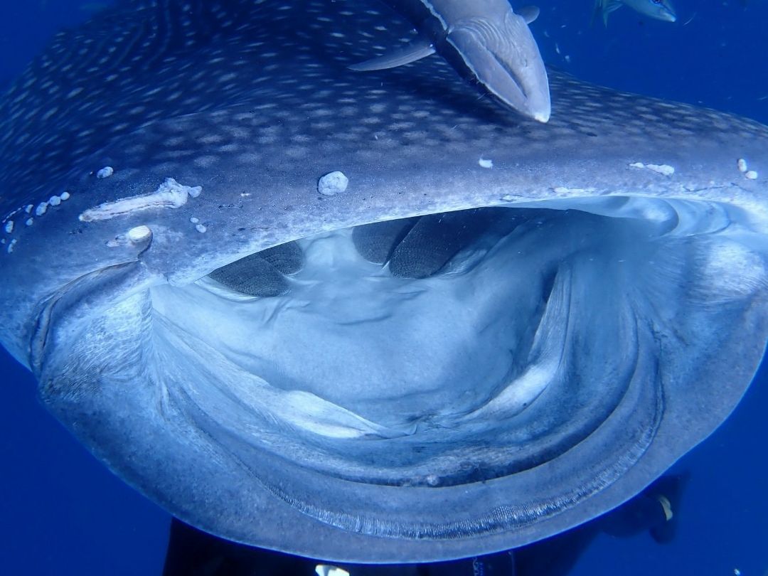 まず、他のダイビングショップのお客さんとの乗り合いですが、港で船に乗り、ジンベエザメの待つ沖合へと向かいます。シュノーケリングの時間は、ちょうど私たちが上から見やすいところに浮上してきてくれるジンベエザメのお食事タイムに合わせてくださっています。ですので、間近で大きな口や、大きな体を眺めることができます!夢中になって、ついもっと潜りたくなってしまいました。