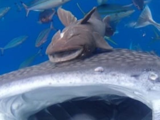 目の前を優雅に泳ぐジンベイザメとコバンザメたち。