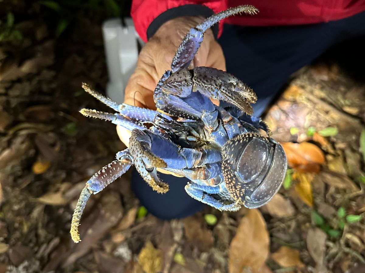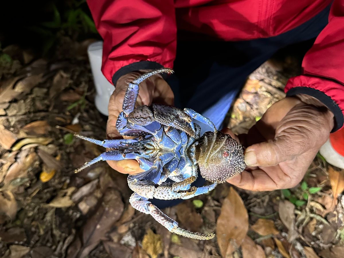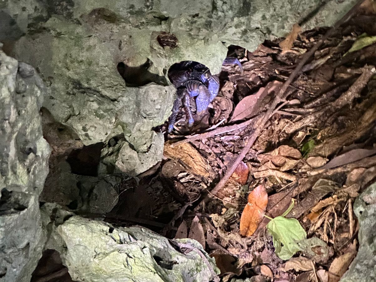 小雨が降ってたので心配でしたが、さすがベテランのガイドさん。経験を活かして当日待ち合わせ後に違う場所へ移動。石の間に1匹目のヤシガニ発見‼︎その後、森林の奥の方にガイドさんが下がり探しに行ってくれて…BIGヤシガニを見つけてきてくれました‼︎