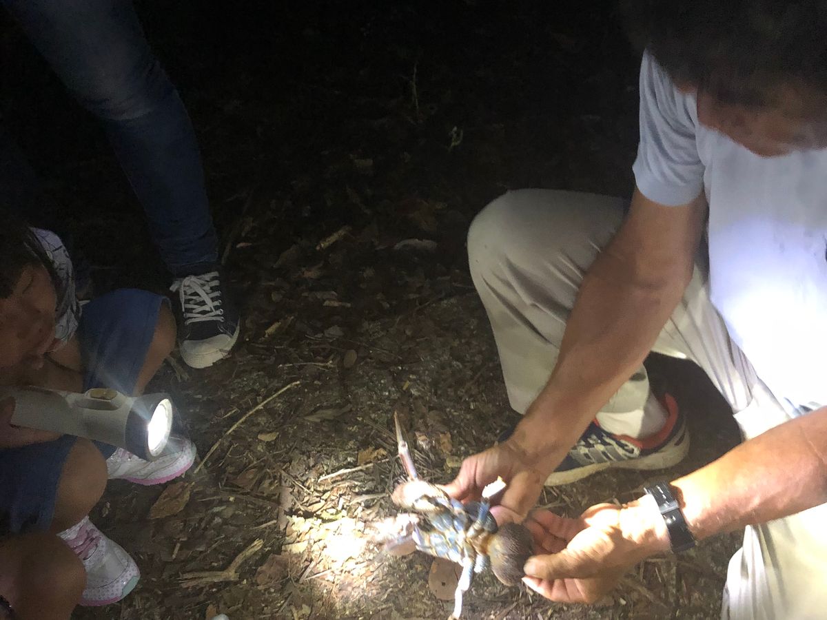 最後にヤシガニが見られるポイントへ向かいました。着く直前にヤシガニが道端に現れ、運良くヤシガニも見られました。ガイドさんが杖を使って捕まえてくれ、写真もバッチリ撮れました!