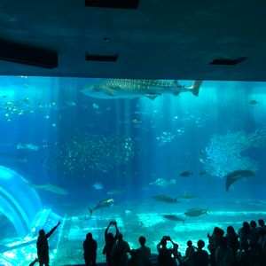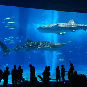 美ら海水族館の黒潮の水槽前で
