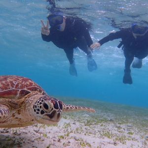 あいにく台風の影響で波やうねりが強く、パンプキン鍾乳洞には行けませんでしたが、かわりにウミガメシュノーケリングをさせていただきました。