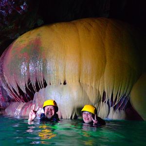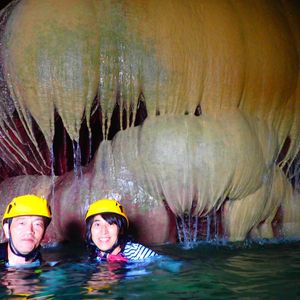 今回、宮古島初体験でした。その中でも鍾乳洞ツアーは、心底楽しみにしていたのですが、他社でたのんでいたツアーから、急遽中止の連絡があり、御社に頼むような気持で申し込みました。当日は潮流の関係で、現地までは「カヌーを漕いで行く!」とのツアーガイドさんから、早速にハプニングツアーのお知らせ。マリンスポーツも同時に楽しめる、と思って、喜んでいたのも束の間!波の激しさに鍾乳洞に着くまでに、転覆する艇もありました。過酷な試練を乗り越え、鍾乳洞の中にはいると、神秘そのもの。「100年に1cmしかのびない」という先端を見上げ、島のパワースポットに魅了されました。それにしても、ツアーガイドさんの頼りがいのある、たくましさ、そして、優しさには敬服です。数々のハプニングにも顔色ひとつかえず、真っ白な歯で、微笑んでくれる、その姿には人間としてリスペクトです。このツアーを選んで良かったです!