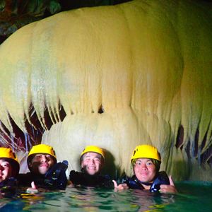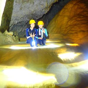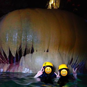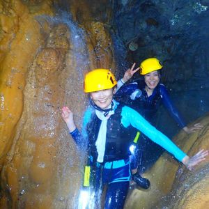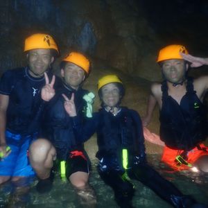 鍾乳洞の中は残念ながら基本的に撮影禁止です。ただし、インストラクターのカメラで撮影した写真を後日LINEに送ってくれるので安心してください。道中の撮影等で携帯を持っていく場合は防水対策をきちんとしていきましょう。全身ずぶ濡れになります。