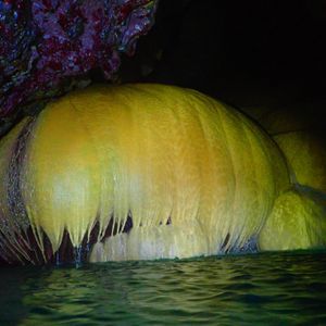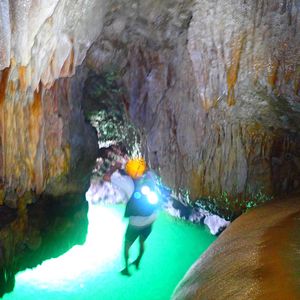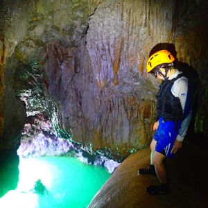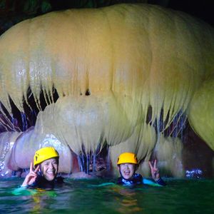 ビーチから徒歩30分程海の中を歩いて向かう途中、崖の上から流れる水が滝のように落ちてくるところを間近に見れました。滝を過ぎれば、海の中に空く小さな洞穴から泳いで入ると、すぐ先に、鍾乳石が現れました!こんな場所にこんなに大きなものが広がる世界が、とても神秘的でした。