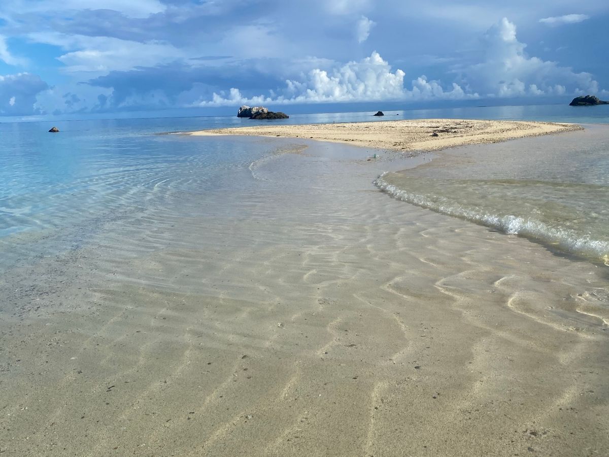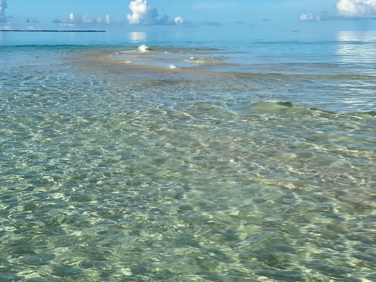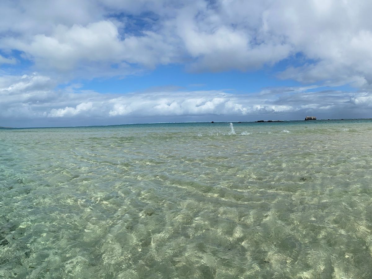 水が胸くらいまでの位置でみんな船を降りて、島に上陸すると遠浅に広がるビーチと周りを海に囲まれて不思議な感覚にもなりました。