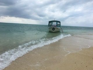 船に乗って20分くらいすると海の色がエメラルドグリーンに変わってきて、徐々に海底が見えてサンゴ礁が見えてきたら、クロワッサンの形をした「幻の島」が見えてきます。まず、その砂の白さと海の透明度の高さにまずびっくり!!