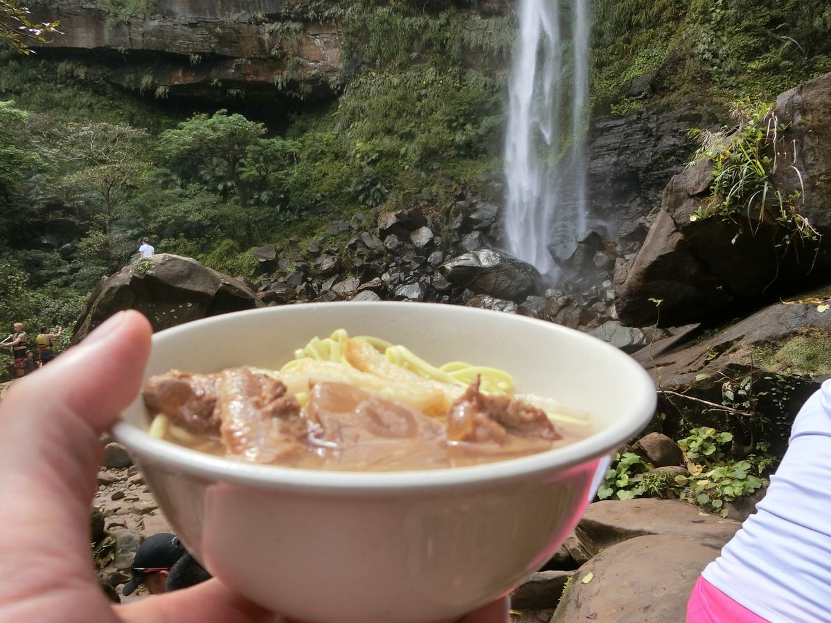 お昼は八重山そばとおにぎり。滝を目の前にしての食事は美味しい。