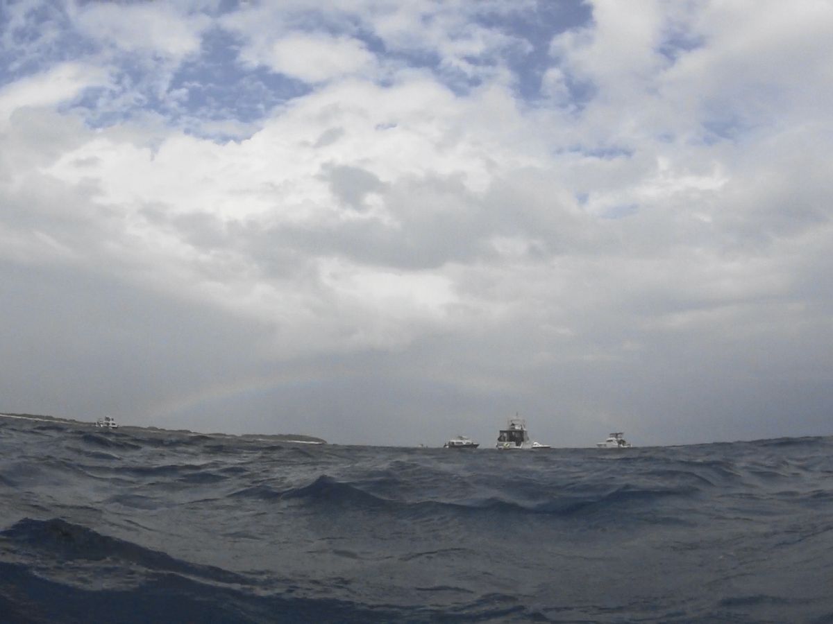 雨混じりで10m風速で悪天候であったが、ボートでの移動も揺れ少なく、