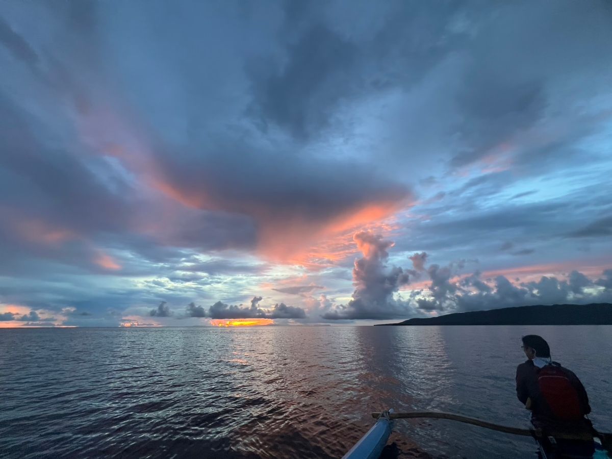 まだ薄暗い中港に到着した時は雲が多く遠くで雷もなっていましたが、説明を聞いて出港する頃には雲が赤く染まりだし、だんだんと朝焼けが見えてきました。