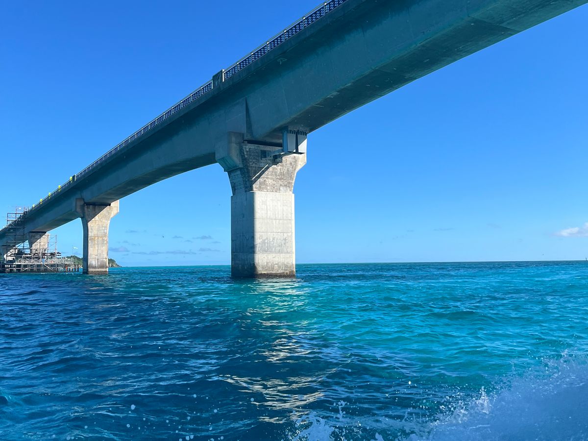 池間大橋を船でくぐるのも、なかなか出来ないことなのでそれも記念!!ポイントまでは船でスピードを出して行くので、船はやや波の揺れを感じますが、先に見えてくる景色を想像してあっという間です
