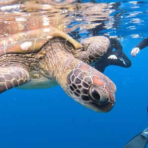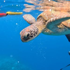 前夜豪雨、当日朝も曇り空で心配しましたが、予定通りに体験することができました。気さくな担当のお兄さんが丁寧に説明してくださりました。初めてのシュノーケリングと思ったよりしっかり泳いでいくことに少しドキドキしましたが、無事にウミガメさんと出会うことができ、2匹のウミガメが近くで泳いでいる姿や、また少し離れたところでも出会うことができ嬉しかったです!岸の近くはやや濁っていましたが、ウミガメのあたりの海は綺麗で珊瑚礁もよく見えました!
