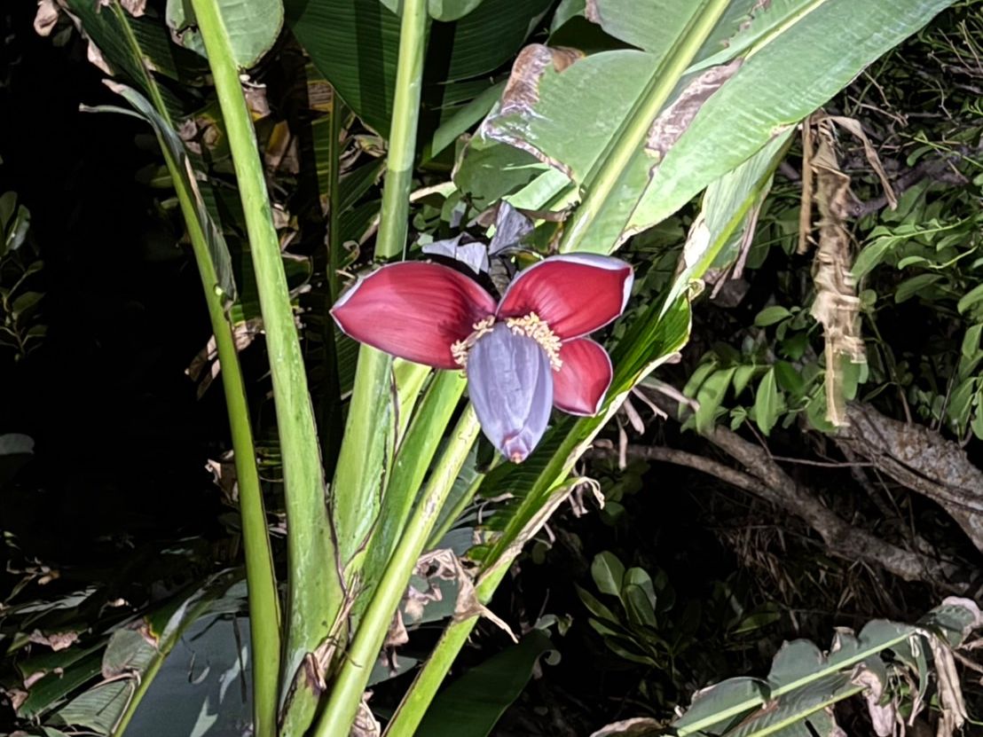ただ、ガイドのお姉さんは参加者に気を配りながら一生懸命生き物を探してくれましたし、そもそも冬の夜のジャングルに入る体験がまず味わえないので楽しかったです。出会えた生き物は熱帯らしい植物に加え、カニやカエル、サソリ、ナナフシの幼虫などでした。