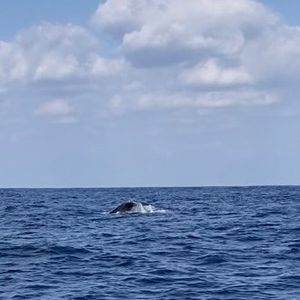 当日は天候も良く、波も穏やかな中でホエールウオッチングを体験できました。出港してしばらくした後、子クジラ1頭と大人のクジラ2頭が波間に浮かんでいるのが見えました。ちょっと遠かったですが、はっきりとクジラのいることが分かり感動です。その後もクジラは潜ったりまた浮かんだりを繰り返し、それをゆっくりと追いかけてみることができました。