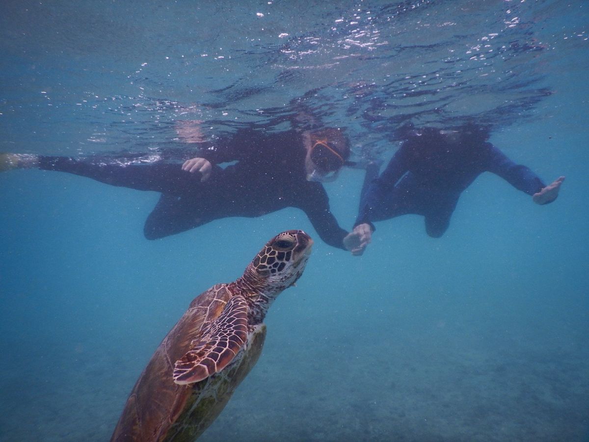 シュノーケルもとてもきれいな浅瀬の海岸でウミガメ以外のきれいな熱帯魚も近くで見れて大満足。