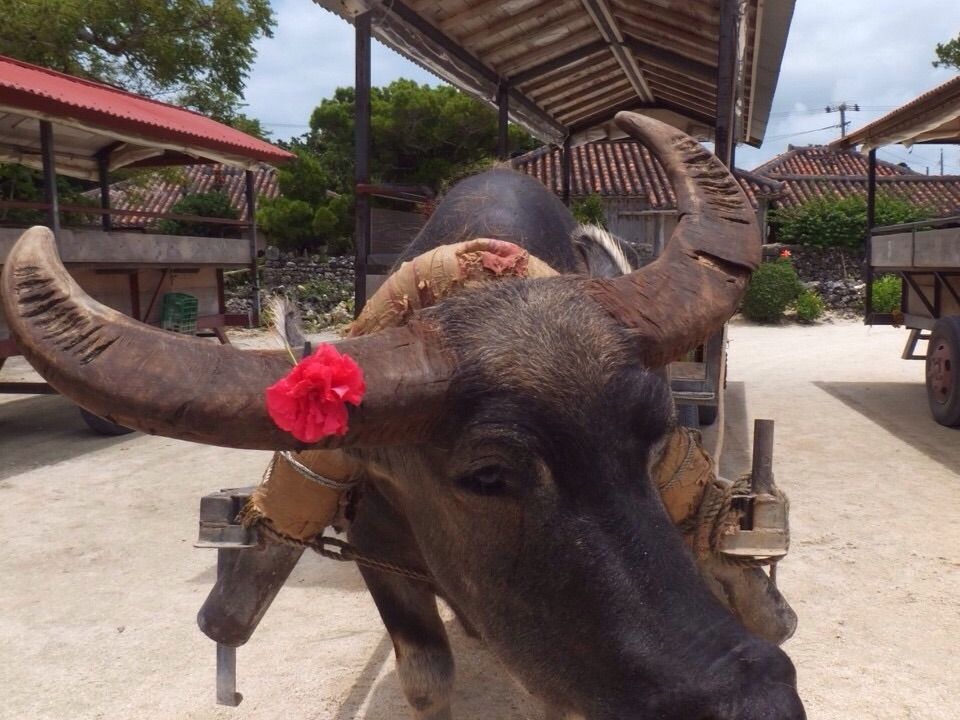 台風前の7月4日に友人二人で参加しました。一番のイケメン水牛 「ゆうじろう」 に乗車し、由布島へ。植物園になっている島を散策し、前日泊まった小浜島を眺めながら泡盛のジェラートを食べて休憩し、水牛プールで涼をとっている赤ちゃん水牛を見て癒された後。長老の水牛(名前は忘れちゃった)の車に乗って戻ってきました。