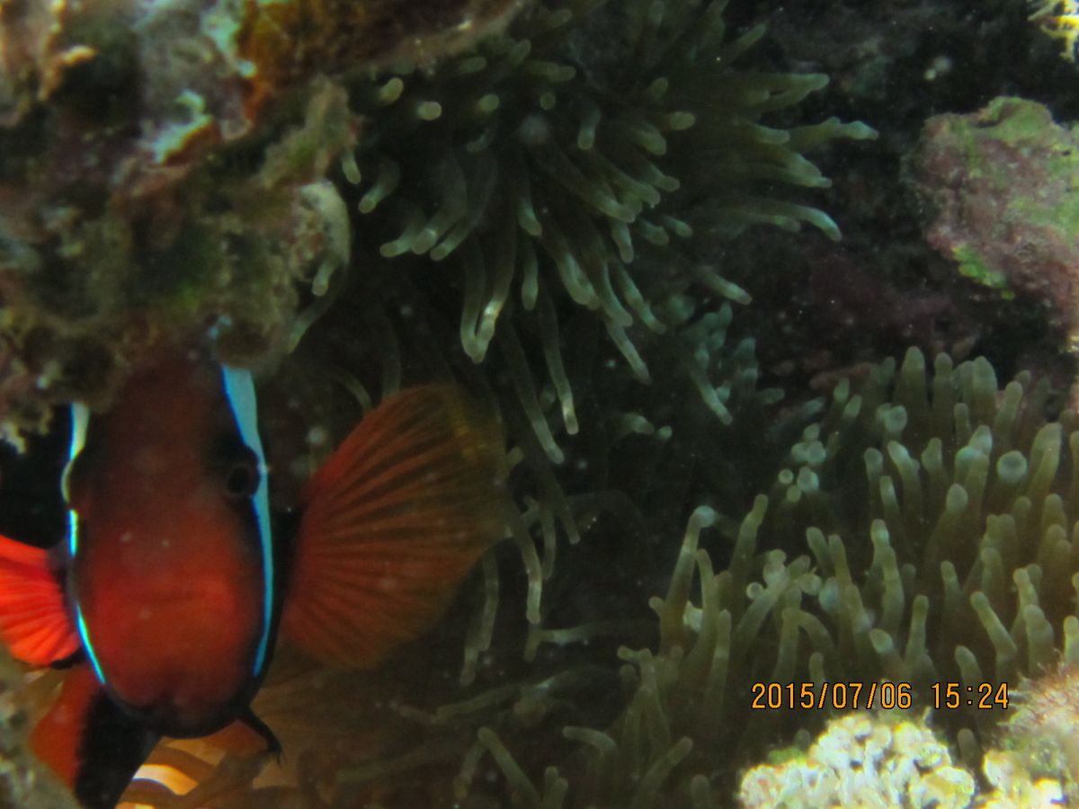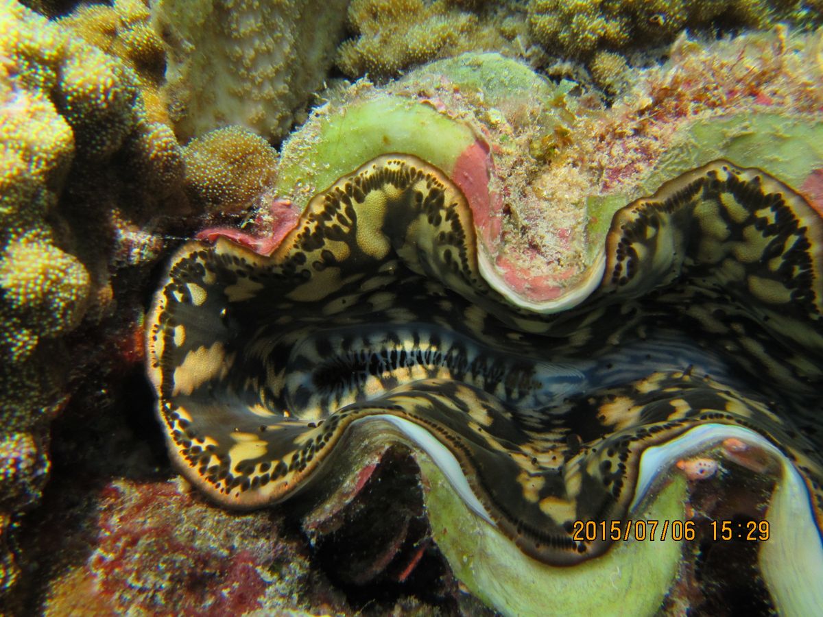 抜群の透明度。珊瑚は昔に比べると減ったようですが、クマノミポイントや大きなシャコ貝等