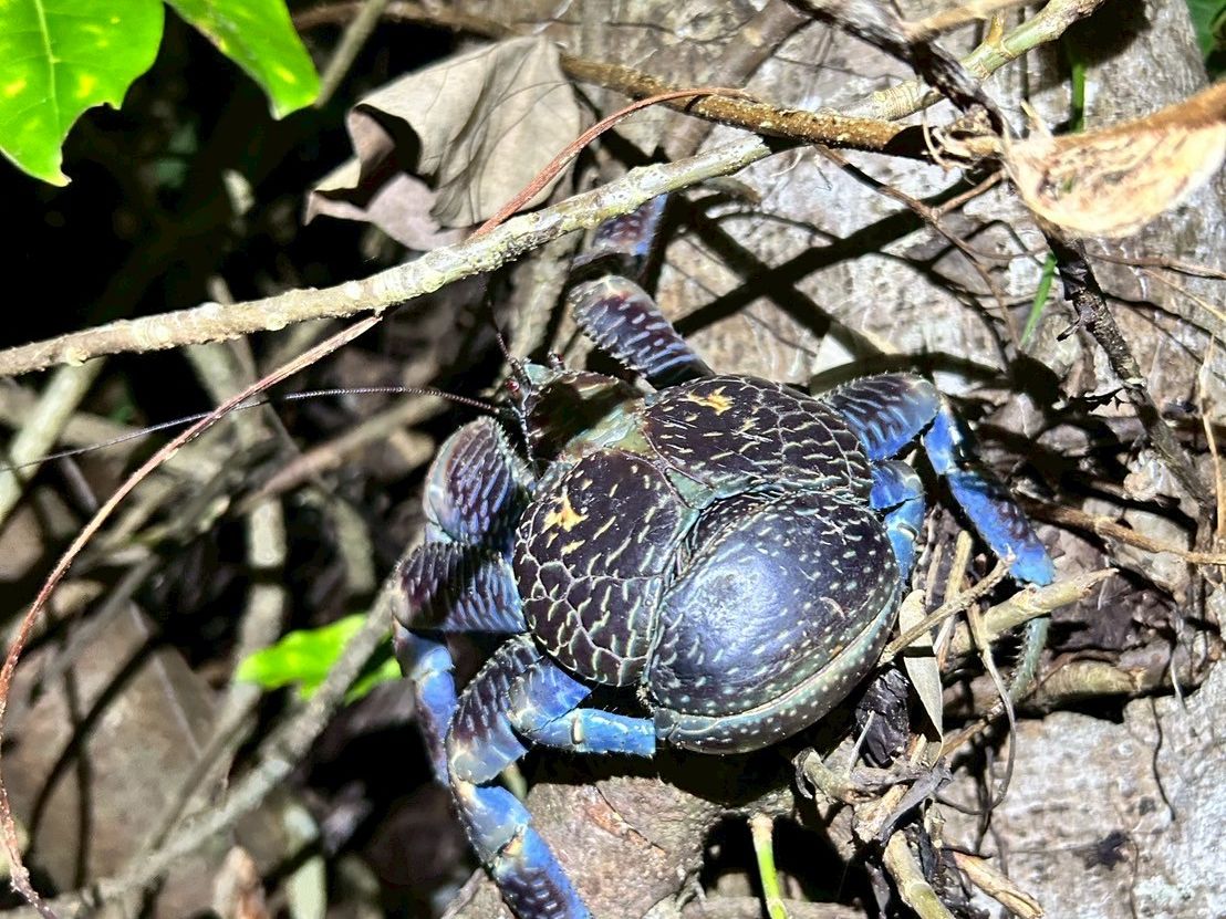 ヤシガニも見つかり、木に掴まらせてくれたので重さも感じられて、写真もゆっくり撮れました。更に大きなヤシガニも探してくれて、オスメスの違いも良くわかりました。