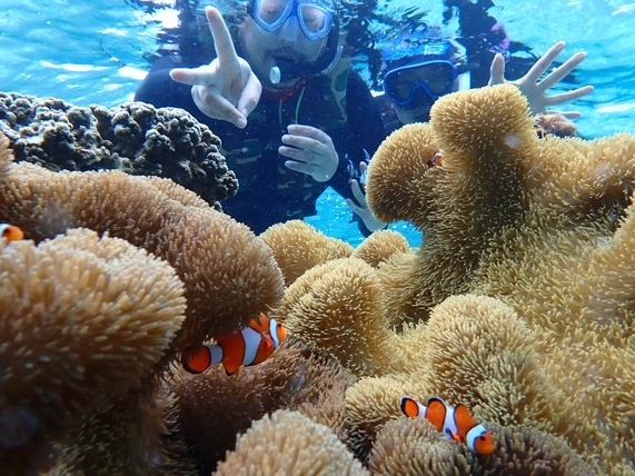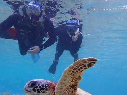 初めてのシュノーケリング体験で、海の透明度にびっくりしました!色鮮やかな魚がいっぱいいて、ウミガメも見ることができ、一緒に写真を撮っていただきました。