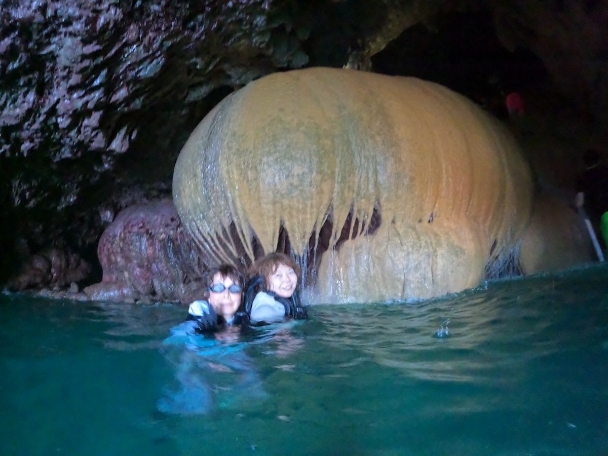 55歳と57歳で参加、こちらの鍾乳洞は御嶽に使われていた神聖な場所なので、もしかしたら行けなくなるかも!との事もあるらしいので、参加限界の60歳までに行けて良かったです。沖縄は天気がコロコロ変わるので前日申し込みしましたが、こちらは潮位の関係もあって、申し込みは出来ても参加になるかは分からないので、時間が限られる場合は早めが良いかも知れません。時間も目安なので、事前メール必須です。送迎は無料でしていただけたので、安心でした。カヤックで洞窟前まで自力に自信が無かったのですが、紐で繋いで介助があり助かりました!鍾乳洞内も、滑るのかと思ったら全然滑らずグリップがきいてました。岩に上がるのが今回ハシゴを用意して頂けたので楽に上がれました。鍾乳洞内は灯りが基本無いので(懐中電灯はあります)鍾乳石がキレイな色を保っていて、地上の鍾乳洞よりキレイなのでオススメです!今回、梅雨の時期だった為、水がシャワーの様に降り注ぐ場所があり、本当に自然に出来てることが神秘的でした。ラストに岩場からダイブするのが勇気が試されました(汗