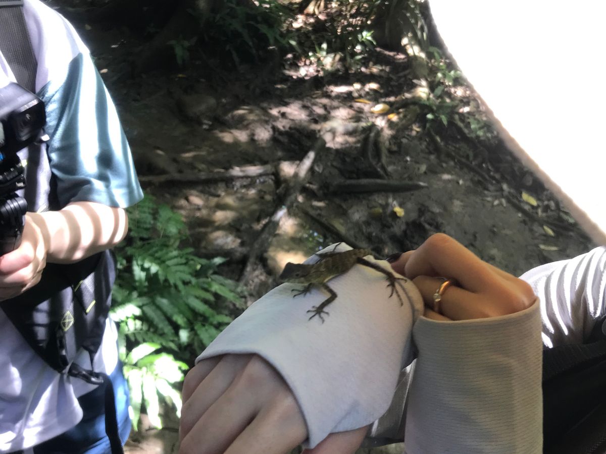 ・カヌーを降りてジャングルをトレッキング。途中で島特有の爬虫類を見つけ