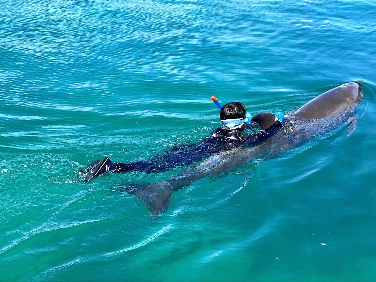 着替えて説明を聞いてイルカと触れ合ってから水中へ。6人で1人ずつ順番にイルカに引かれて泳ぎます。背ビレに捕まるのが2回、胸ビレに捕まるのが2回、最後にイルカが横に来てくれて写真撮影。1人ずつなので水中にいるのは計40〜50分くらい。着替えてプレハブまで送ってもらって終了。