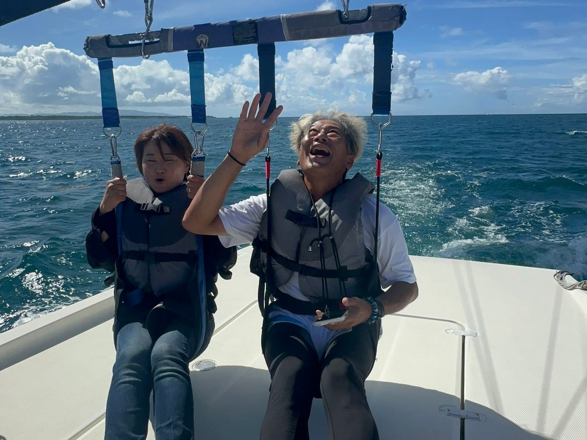 外洋を高い位置から眺めたことは最高のスリルと感激でした。海に浮かぶ雲も本当の夏の雲でした。また、パラセーリングに携わっていたスタッフの皆さんがすごくカッコよく見えました。
