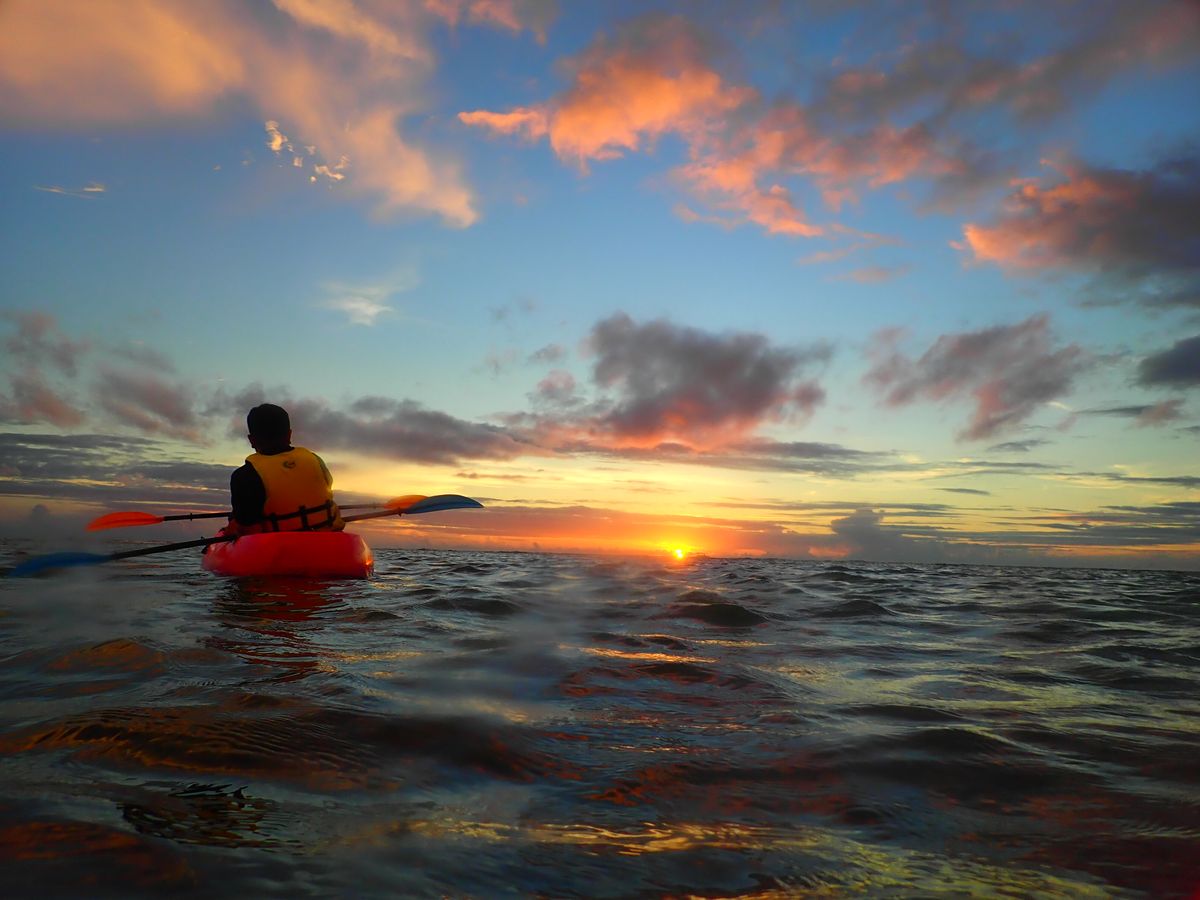 気持ちの良い風が吹く広い海の上でカヤックに乗り、ゆっくり海に沈んでいく夕日を見るのは、最高です。
