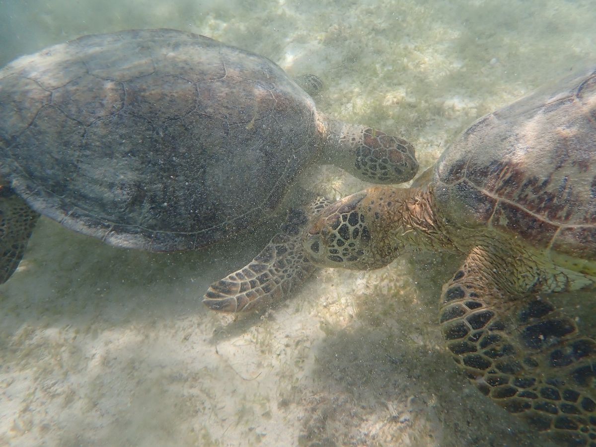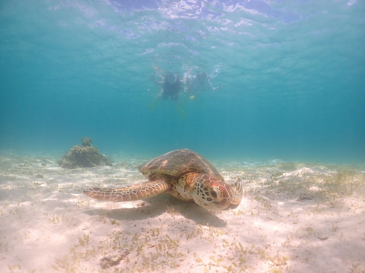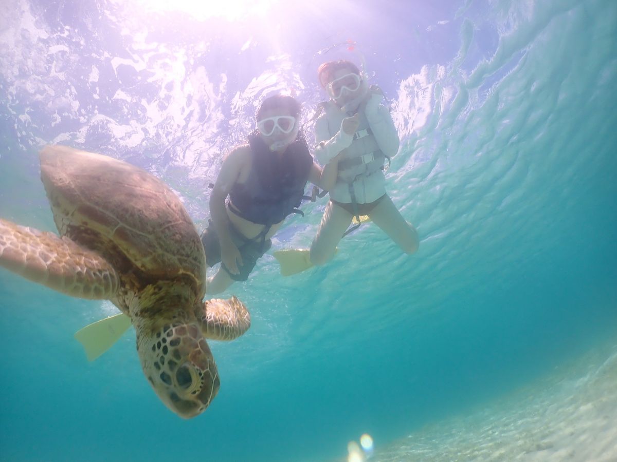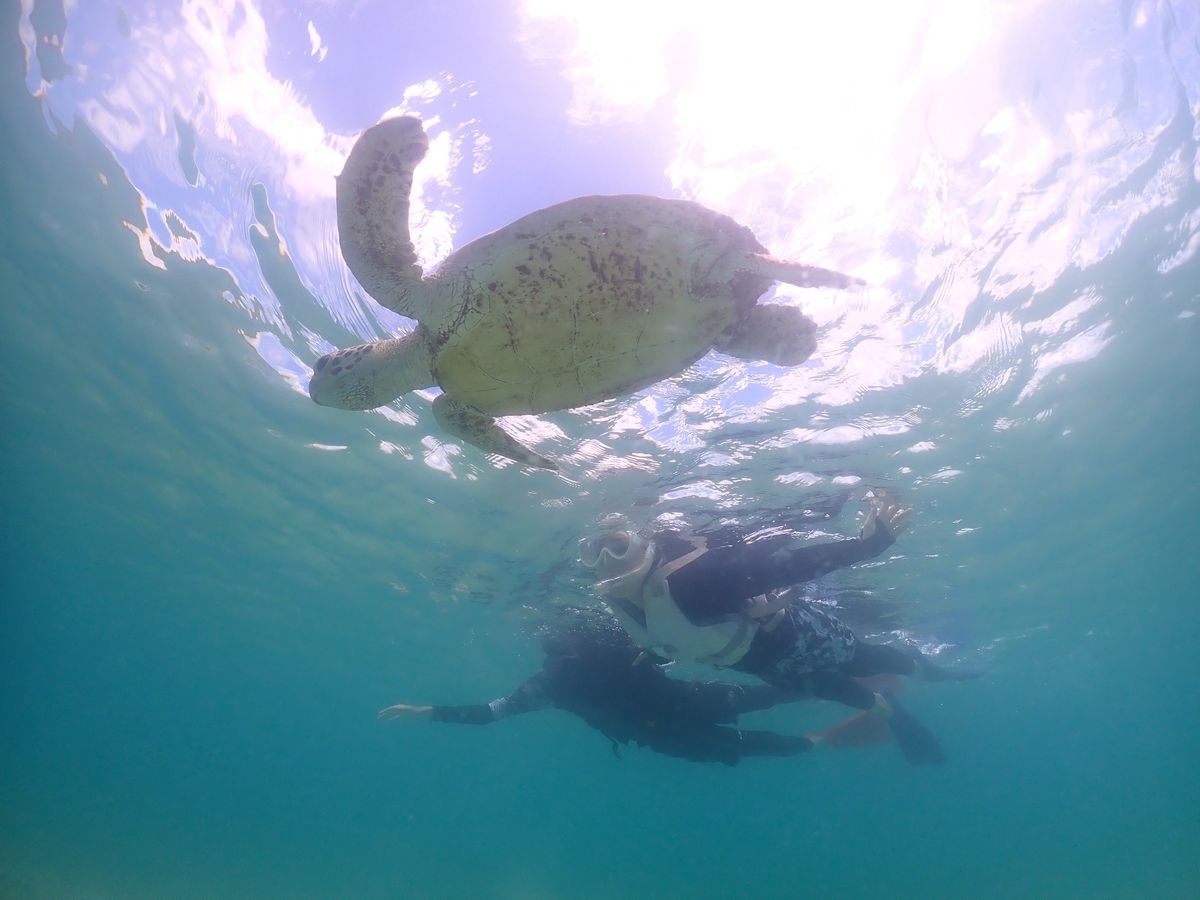 はじめにシュノーケリングの説明を受けて、すぐに海の中へ!7月の平日15時頃であったので人も少なく快適でした。しばらくもぐっているとガイドさんがウミガメを見つけてくださり、そのポイントに誘導してくれました。3匹のウミガメに会うことができ、ガイドのるいさんともえかさんのお話もとてもタメになることも多く楽しかったです!写真もいっぱい撮ってくださって大満足でした!