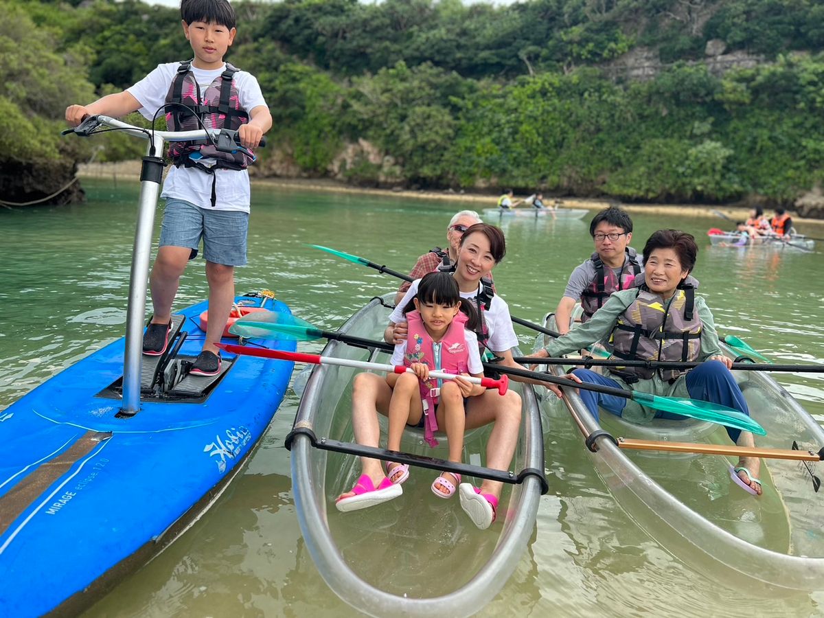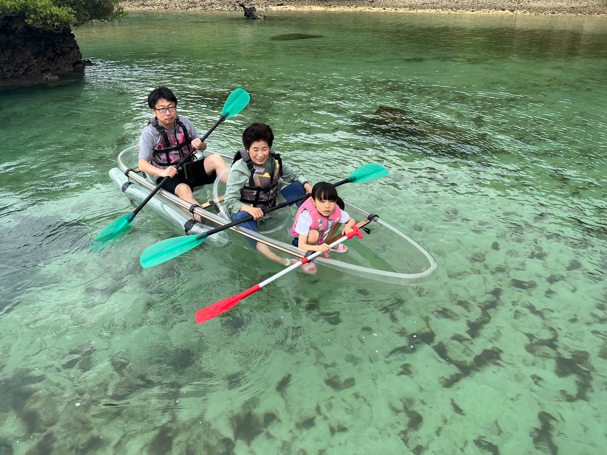 3/28 11:00 インギャーマリンガーデンにてクリアカヤックを体験しました。駐車場に着いて連絡を入れると、5分ほどで笑顔のスタッフが迎えに来てくれました。最初に全体の流れの説明を受け、その後、カヤックの漕ぎ方を丁寧に教えてもらいました。76歳の両親、私、夫、息子(小5)、娘(小1)の6人で参加しました。3人ずつ2台で出発しました。お天気は曇り予報でしたが、薄日が差すこともあり、気持ちの良い天気になりました。曇っていても、海は綺麗で、透明度抜群です。船底に青い魚やクマノミなどたくさん見られました。スタッフさんが、魚がいるポイントを教えてくれま