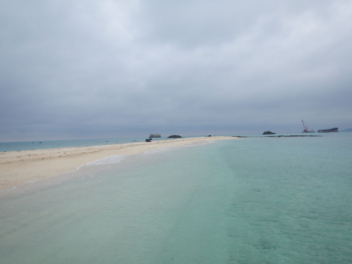 朝一番のツアーに参加しました。まだ他のツアー客も居なくて私達のツアーが初上陸でした。上陸のみのツアーにしてましたが水着を上下とも着てその上から上着を着ました。上陸時間の潮の満ち引きにもよるでしょうけど、膝上までは余裕で浸かりながら(身体163センチです)数歩だけだけど歩くので濡れます。念の為、着て行った上着とは別にユニクロのウルトラライトダウンを持っていきましたが大正解。オープンな船でたまに水飛沫が顔まで掛かって笑いながら向かいました。海開きしたばかりで寒かった。曇りだったので、空が残念な感じでしたが砂浜に足跡も無くて、海は綺麗でした。ツアーのお兄さんがフレンドリーに話しかけてくれて家族での写真も上手く撮ってくれました。珊瑚礁のかけらを拾い持ち帰りました。帰る時は他のツアーの船がたくさん来て、人だらけになった幻の島でした。座礁した船が半分くらいになっていて事故をニュースで見たなぁと思いました。解体も大変でしょうね。