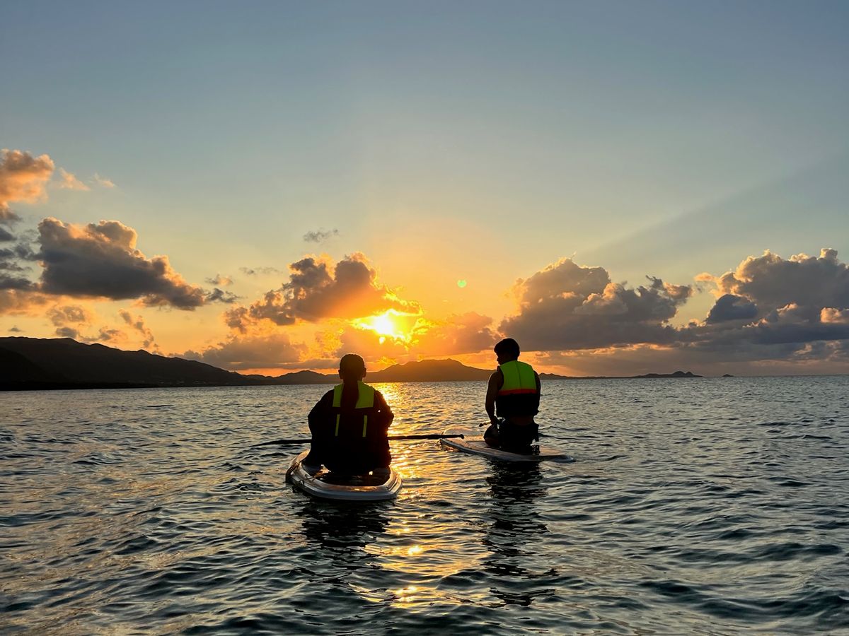 尖閣神社で待ち合わせ。300円で使えるシャワーもありました。ガイドのジョージさんは、遅刻してきた参加者にも嫌な顔ひとつせず笑顔で対応されていて好感が持てました。SUPの場所は尖閣神社から車で少し行った、湾みたいな所。綺麗な夕焼けに恵まれ、波も静かで、結構沖の方まで連れて行ってくださいました。参加者はグループ単位で写真を撮ってもらい、岸に上がってからairdropで自分のスマホにデータをいただきました。夕日に対して逆光と順光の両方を撮っていただきましたが、逆光の方が綺麗に撮れていました。