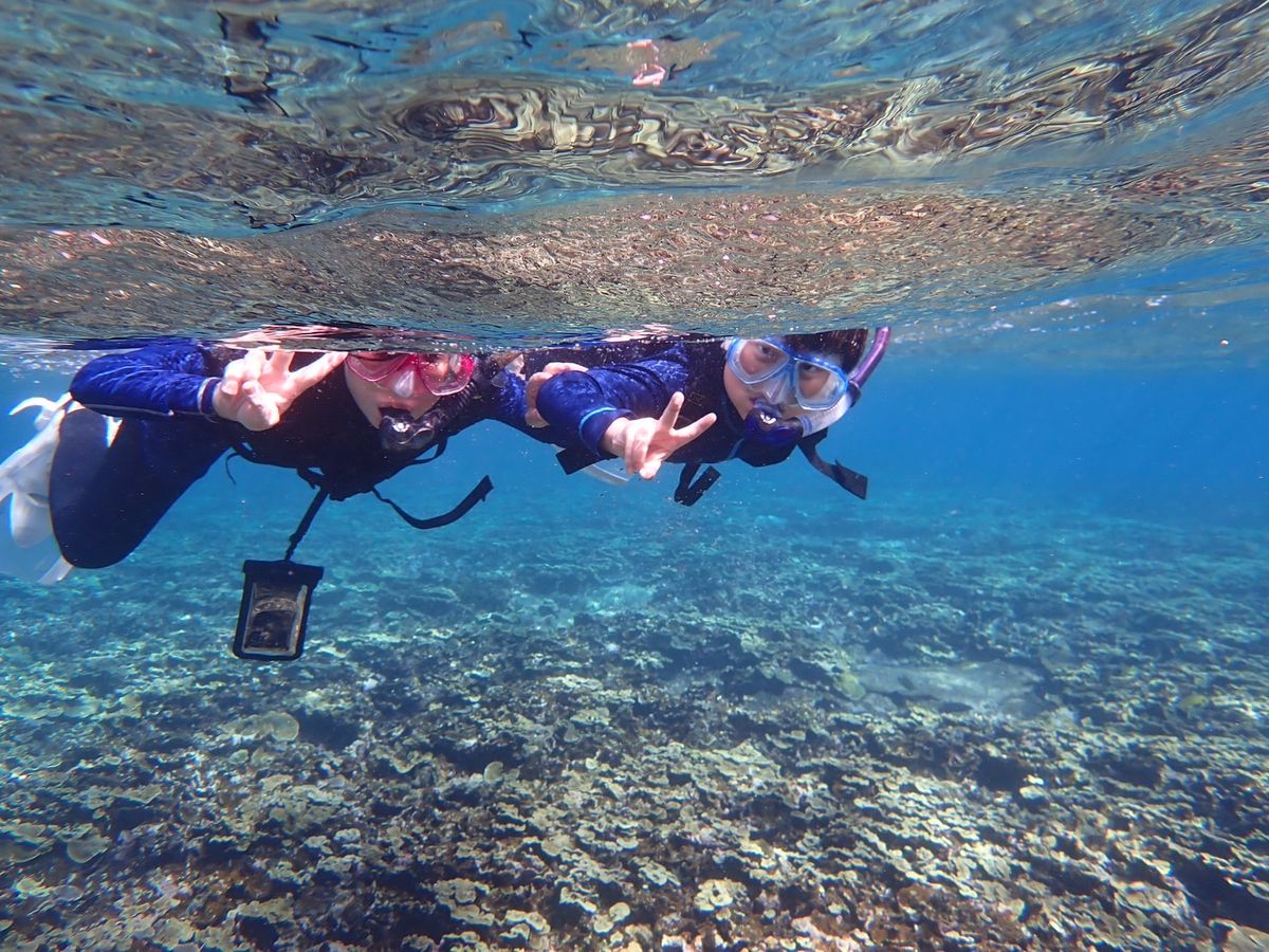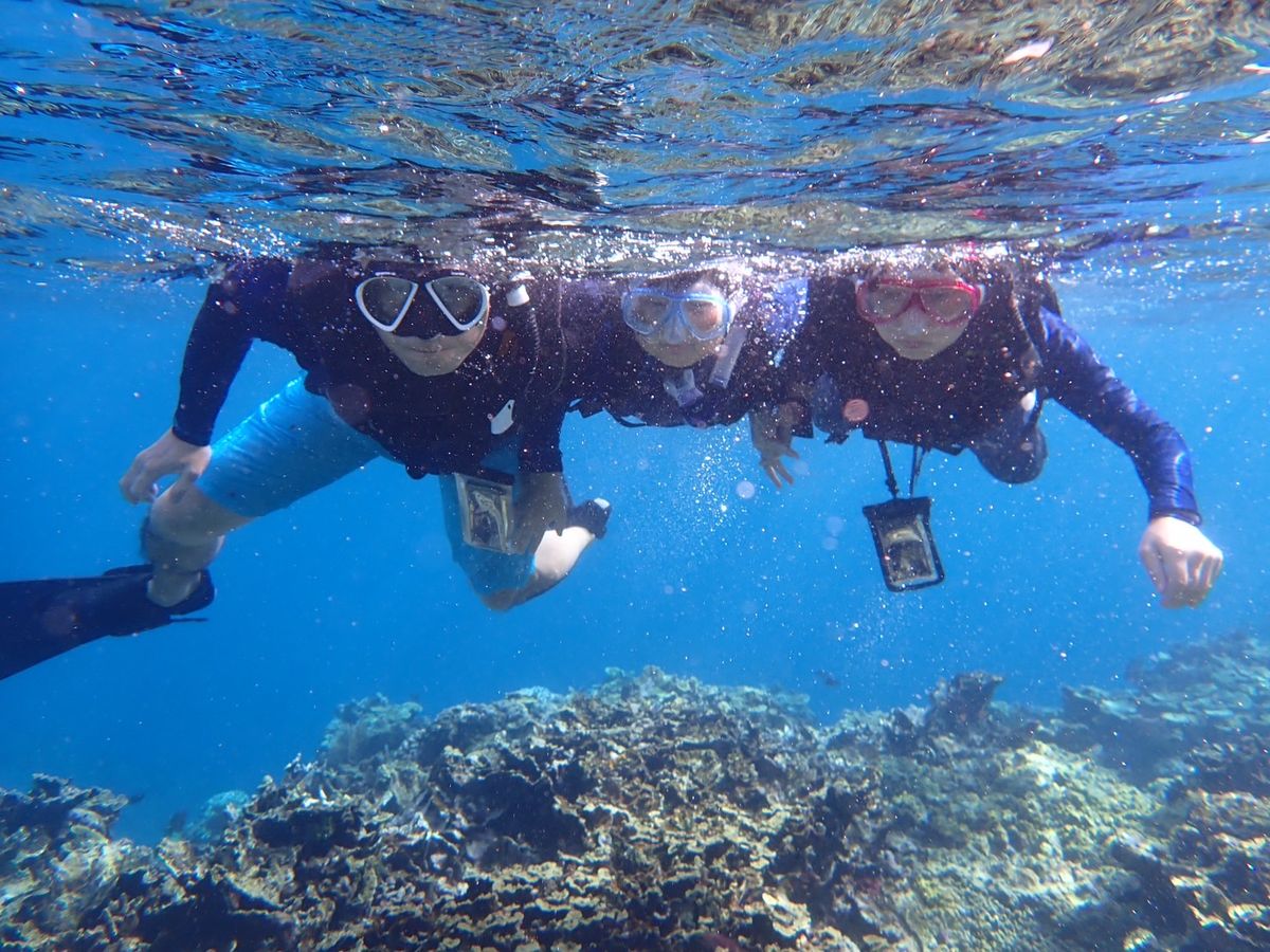 初めてのシュノーケリングでしたが、丁寧に教えて頂いてとても楽しかったです。ライフジャケットを着用しているので足が着かない場所でも心配なく泳げました。泳ぎが苦手な場合でも浮き輪につかまれば引っ張ってくれるので安心です。