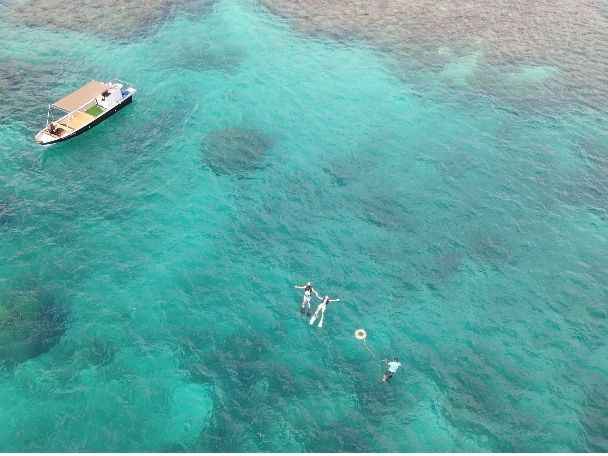 シュノーケリングは担当の方が浮きを持って終始ついてくださっていたので安心して体験することができました。4歳児はまだシュノーケリングはできないのですが、持参した脚入れ浮き輪とお借りした箱眼鏡で様々な種類の魚をたくさん見ることができたようで、楽しい!!と言いながら夢中で覗いていました。残った時間は船の上からジャンプして飛び込んだり、家族全員満喫することができました。