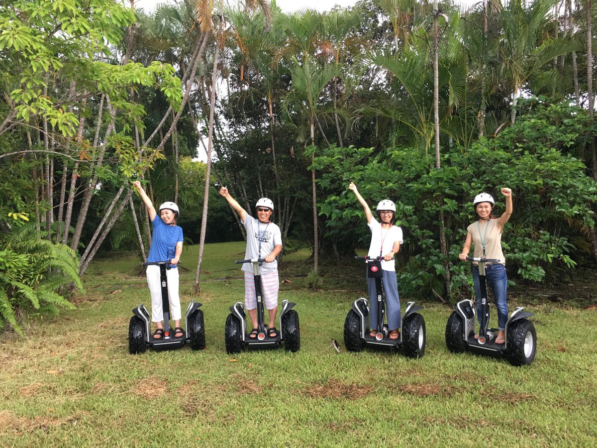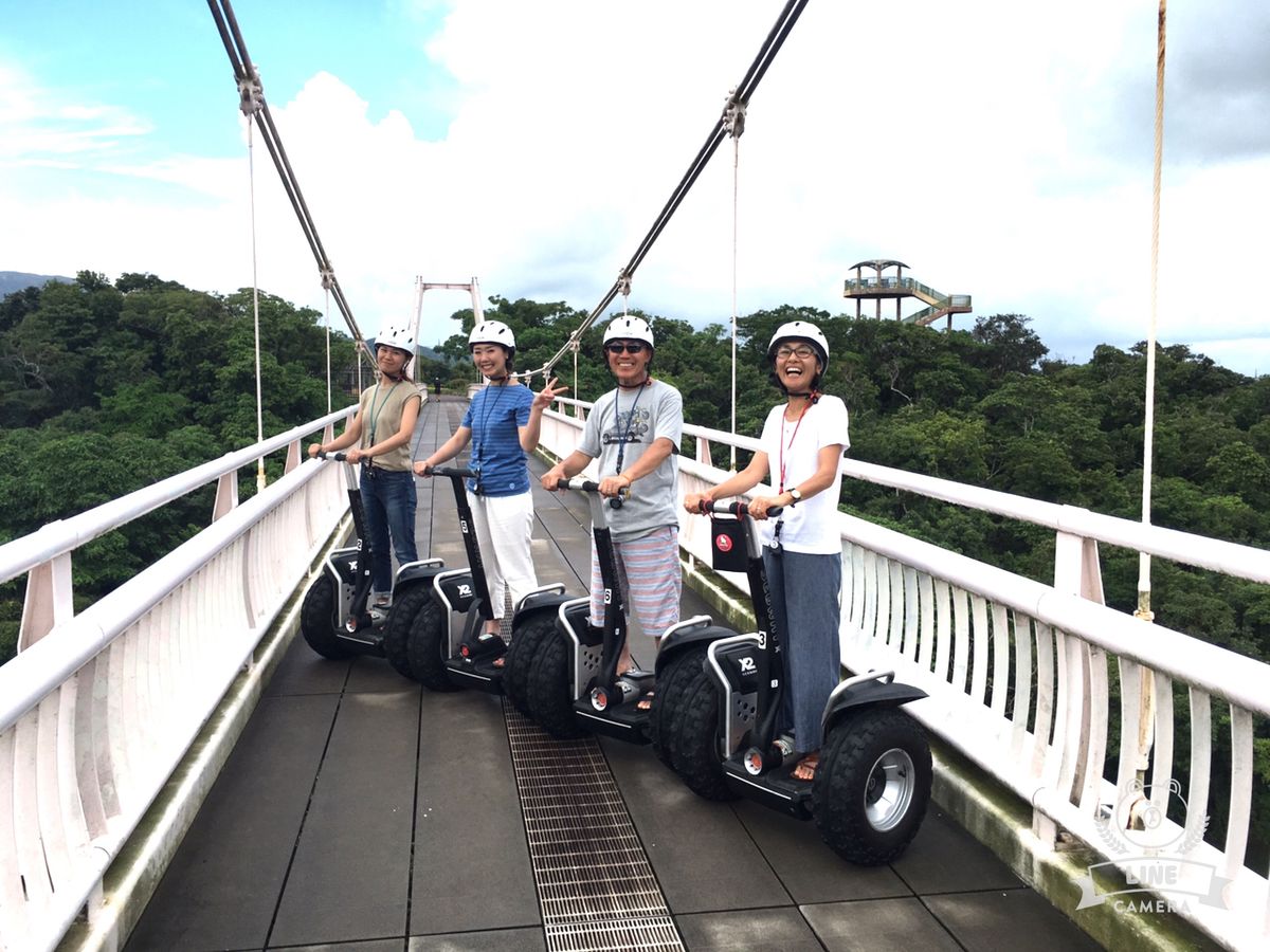 妻が体重不足で乗れるか心配でしたが、実施練習して出来ればOKとの事でチャレンジしたら参加できる事になり*\(^o^)/*当日の天候悪く、心配しましたが、なんとか80%を消化出来ました。〔雨が突然降り、台風発生により〕最初は恐る恐るでしたが、教官が大変楽しい方で、常に笑いが絶えませんでした*\(^o^)/*、セグウェイに乗り教官を先頭に4人後ろに並んでの走行は、まさにカルガモの親子(笑)