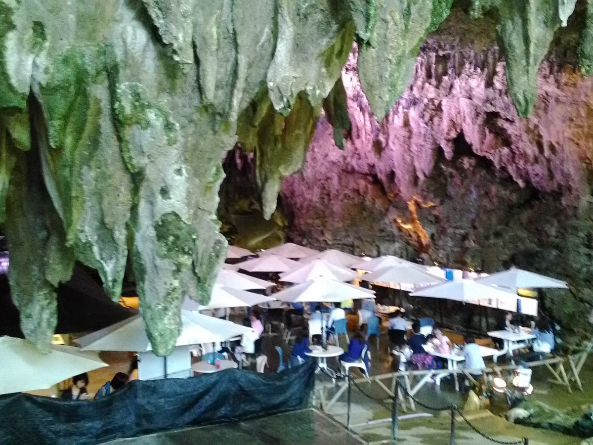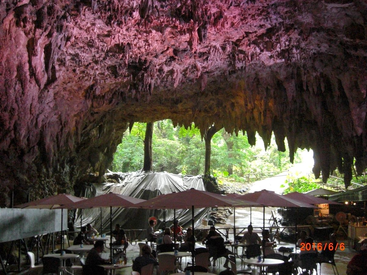 まず、入り口前にはケーブカフェという洞窟内のカフェがあり、そこには天井から鍾乳洞の雫が落ちてくるので、パラソル付きのテーブルと椅子があり、雰囲気がすごく良かったです。その後、1グループ10名くらいの参加者に対して事前の説明がありました。虫除けのジェルがあったのでみんな塗っていました。ほぼ県外の方でした。ツアーは約一時間くらいだったと思いますが、洞窟からジャングルに入ったような感覚になり、大きな竹やマングローブ、サトイモの葉っぱが大きくなったものなど、普段見ることのできないような世界が広がっていました。歩いていくと、女神の鍾乳洞があり、そこで拝みました。その後、一人一個ランプを渡されて、暗い洞窟の中に入っていき、男神があったので、そこでその鍾乳石に触れ、拝みました。そして、トンネルを抜けると大きなマングローブの木があり、そこでみんなガイドの方から記念写真を撮ってもらってました。歩いていくと、木の上のツリーハウスに登っていき、展望台のように眺めがよく、見晴らしがよかったです。