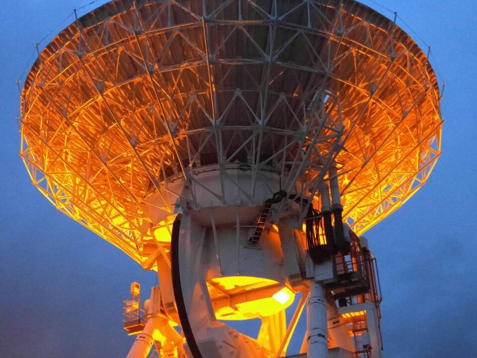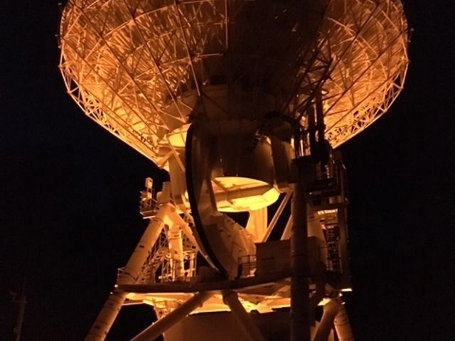 夜の闇の中でライトアップされている大きな望遠鏡を間近に見ることができるので